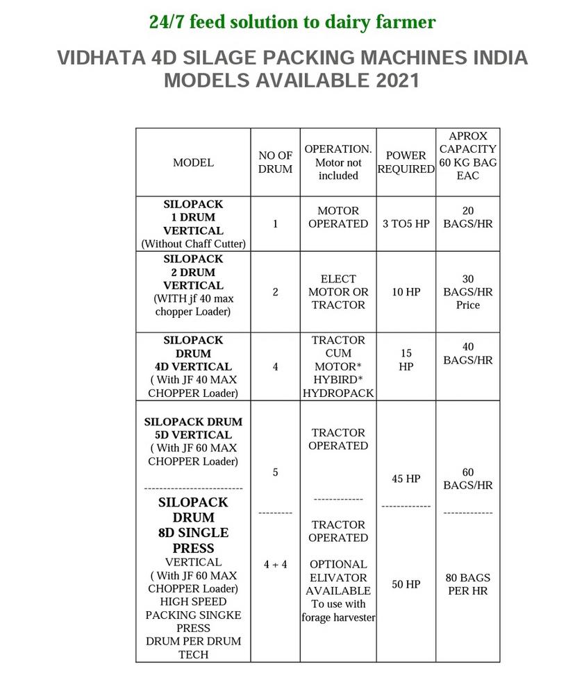 Answer- We have hydraulic press drum silage packing machine that pack small bags of 30 or 50 or 60 kg of silage bags, model available 1d, 4d, 8d